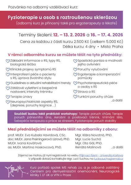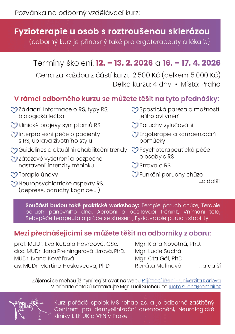 Dovolujeme si Vás informovat o nově vypsaném kurzu „Specifika fyzioterapeutické péče u pacientů s roztroušenou sklerózou“. Jedná se o čtyřdenní vzdělávací kurz, ve kterém získáte komplexní a aktuální pohled na problematiku roztroušené sklerózy. Kurz proběhne v Praze ve dnech 12.–13. 2. 2026 a 16.–17. 4. 2026.